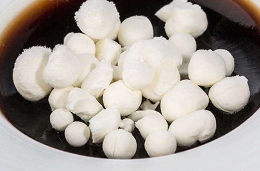Dieses Produkt verwandelt den Macchiato-Kaffee in Espresso-Gelee mit Sahneperlen. Für die Zubereitung nutzt man einen Kaviarmacher, mit dem die flüssige Sahne in einen Brewer mit Stickstoff gegeben wird. Die niedrige Temperatur (-196 °C) verwandelt die Sahne in kleine, weiße Kügelchen, und die Kombination mit dem Kaffee-Gelee zaubert einen magischen Kontrast von Geschmack und Textur herbei. Es ist eine phantasievolle Neuerfindung des Macchiatos mit Espresso-Gelee als Kern. Der flüssige Stickstoff verwandelt die flüssige Sahne in eisige Perlen, die das Rezept mit einem angenehmen Kontrast von Texturen und Temperaturen vervollständigen.